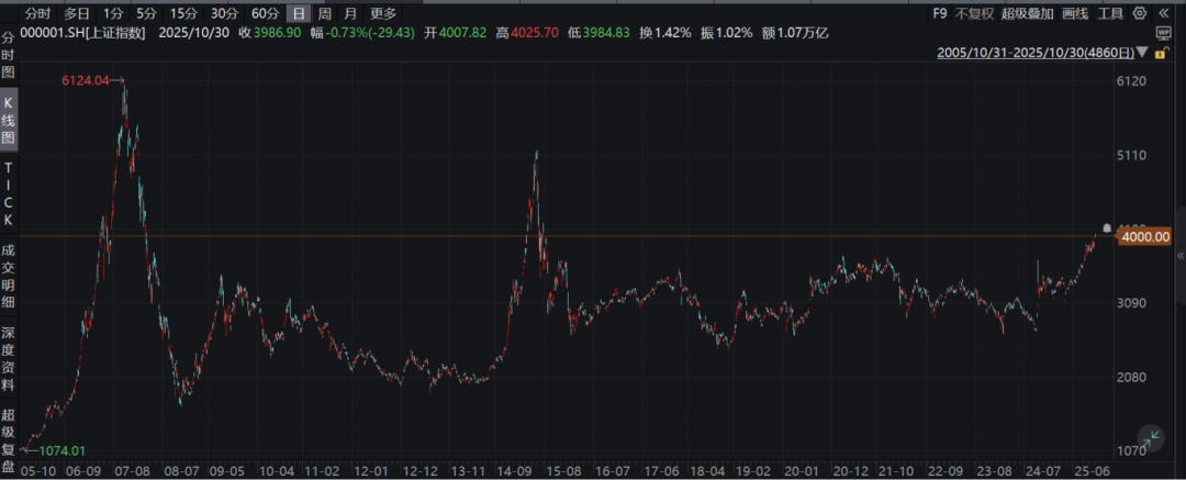 拉长时间线来看,从去年“924”行情至今,A股市场整体震荡上行。10月28日,沪指盘中一举突破4000点整数关口,并于29日收于4000点上方,引领A股正式进入新一轮估值重塑期。