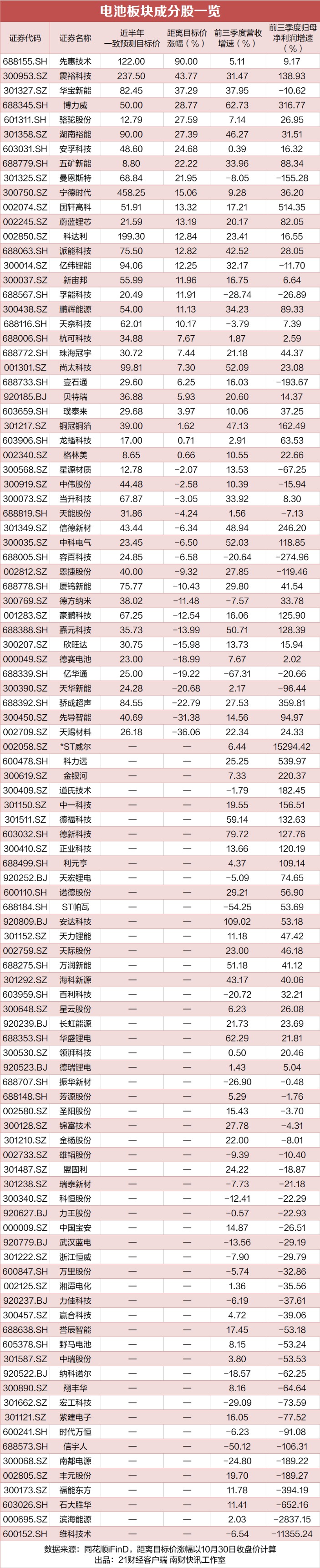 21财经·南财快讯记者梳理发现,截至10月30日收盘,先惠技术、震裕科技、华宝新能的股价距离目标价涨幅空间最大,而宁德时代、亿纬锂能、科达利等相对热门股票的股价距离目标价仍存在超10%空间。