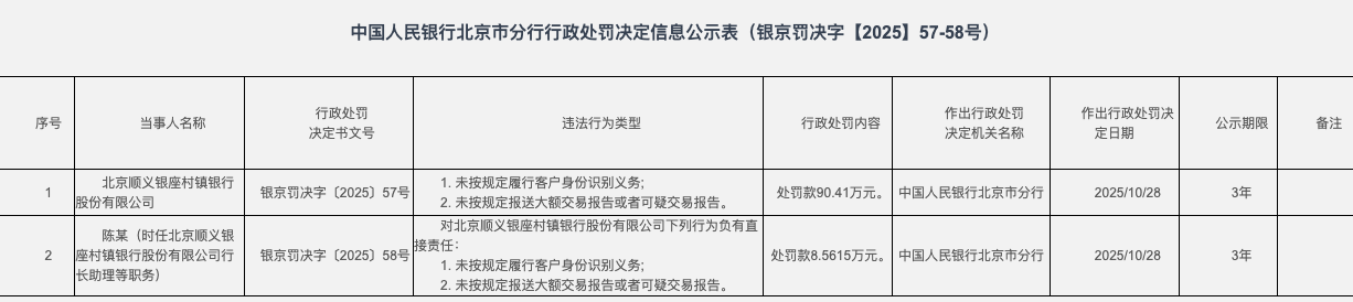 10月31日,根据中国人民银行北京市分行行政处罚决定信息公示表,2025年10月28日,北京顺义银座村镇银行股份有限公司因未按规定履行客户身份识别义务,未按规定报送大额交易报告或者可疑交易报告,被处罚款90.41万元。