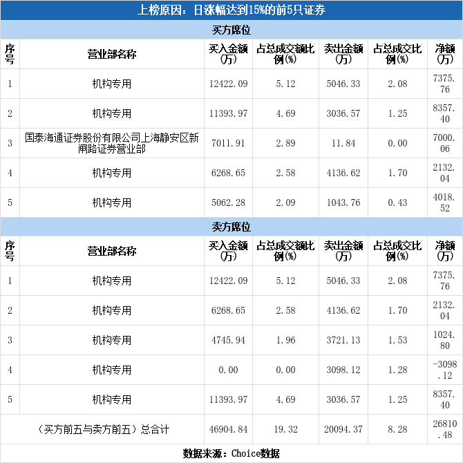 龙虎榜数据显示,今日共9个机构席位出现在龙虎榜单上,分别位列买一、买二、买四、买五、卖一、卖二、卖三、卖四、卖五,合计净买入1.98亿元,占龙虎榜净买额的73.89%。