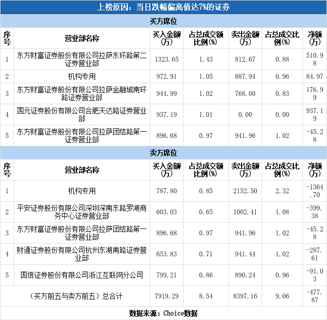 深交所2025年10月31日交易公开信息显示,青岛双星因属于当日跌幅偏离值达7%的证券而登上龙虎榜。青岛双星当日报收6.47元,涨跌幅为-10.01%,偏离值达-9.68%,换手率17.27%,振幅5.42%,成交额9.27亿元。