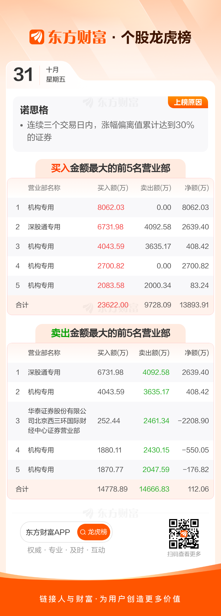 交易所2025年10月31日公布的交易公开信息显示,诺思格因成为连续三个交易日内,涨幅偏离值累计达到30%的证券上榜。诺思格当日收报68.59元,涨跌幅7.00%,换手率14.44%,成交额5.58亿。异常期间10月29日至10月31日,期间涨幅32.93%,累计偏离值33.53%,区间成交额16.93亿。