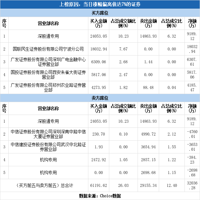 今日龙虎榜单上出现了深股通的身影,占据了买一、卖一的位置,净买入9189.12万元,占当日成交总额的3.91%。