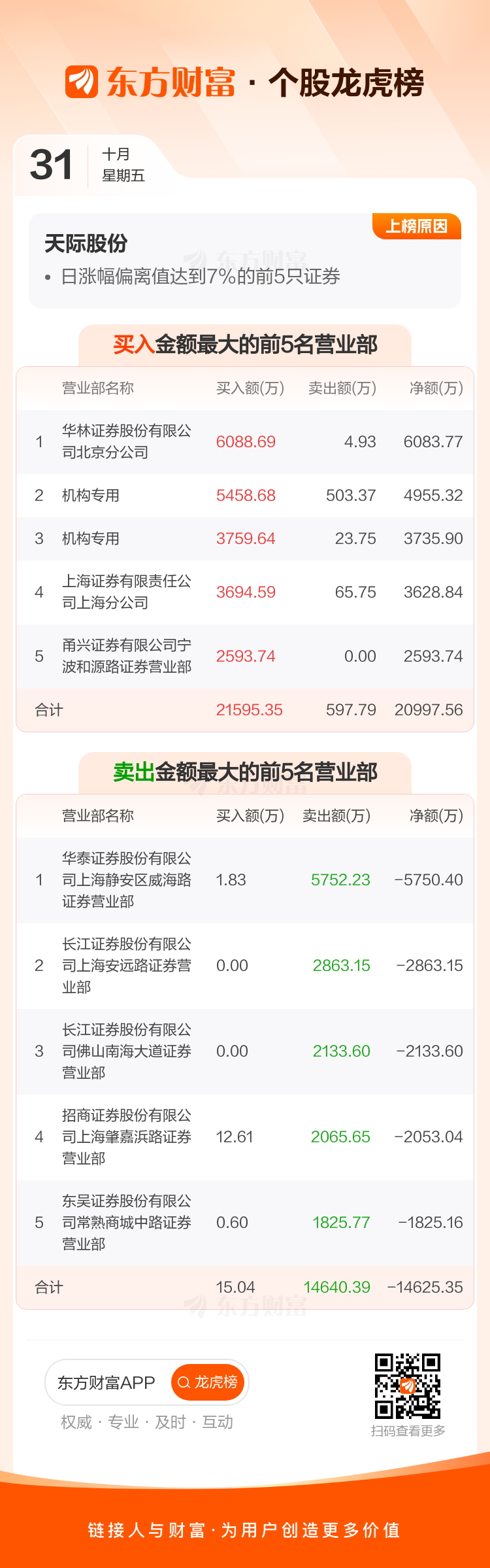 交易所2025年10月31日公布的交易公开信息显示,天际股份因成为日涨幅偏离值达到7%的前5只证券上榜。天际股份当日收报30.84元,涨跌幅9.99%,偏离值10.32%,换手率8.52%,成交额13.04亿。