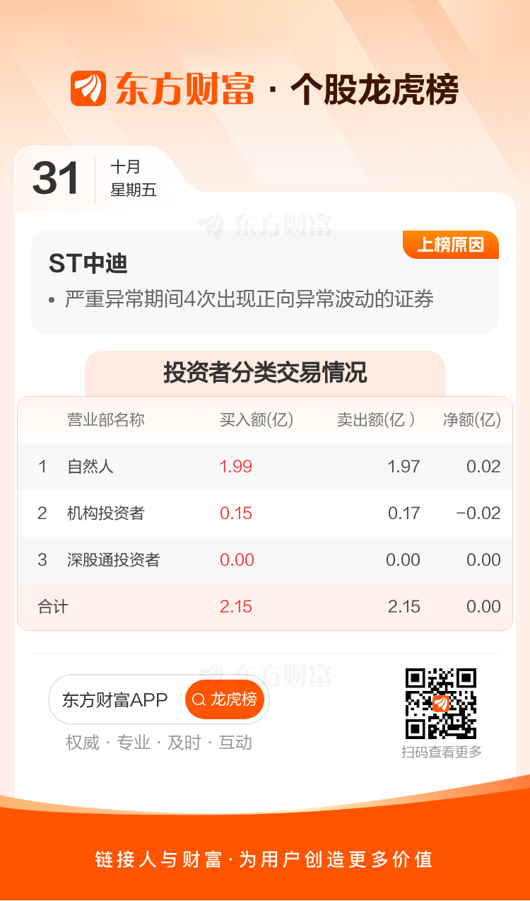 交易所2025年10月31日公布的交易公开信息显示,ST中迪因成为严重异常期间4次出现正向异常波动的证券、连续三个交易日内,涨幅偏离值累计达到12%的ST证券、*ST证券和未完成股改证券上榜。ST中迪当日收报7.25元,涨跌幅5.07%,换手率0.57%,成交额1197.92万。严重异常期间10月16日至10月31日,期间涨幅71.39%,区间成交额2.15亿。异常期间10月29日至10月31日,期间涨幅15.81%,累计偏离值16.11%,区间成交额1.10亿。
