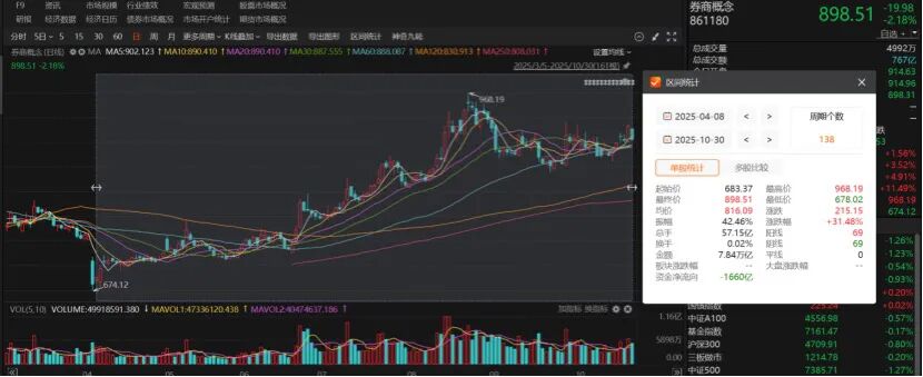 牛市对券商业绩构成利好,券商股价也受到大盘表现、资金交投等因素影响。10月29日券商概念股大涨,但10月30日伴随A股的放量下跌,券商概念股跌逾2%。自4月8日以来,券商概念股累计涨逾31%。