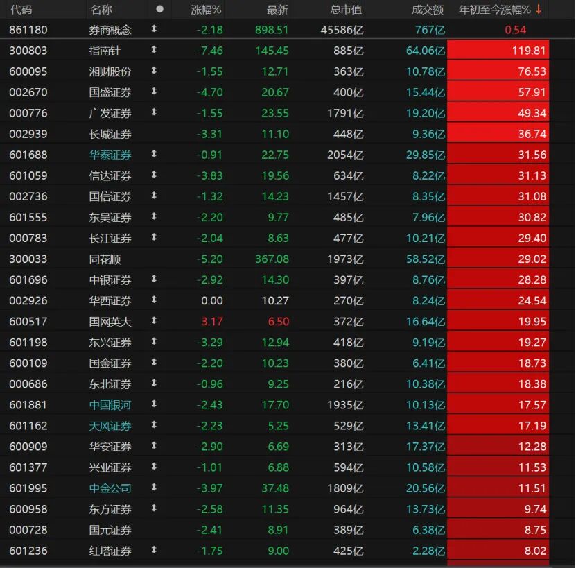 10月30日,券商股多数回调。但从年内券商个股表现来看,广发证券、长城证券、华泰证券、信达证券、国信证券、东吴证券年内涨幅均超过30%。