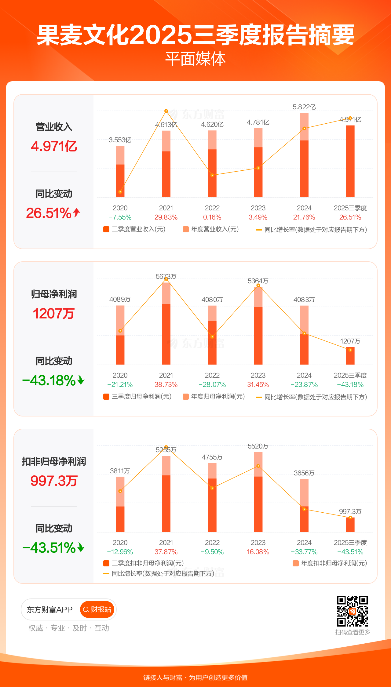果麦文化10月28日发布2025年三季报显示,公司前三季实现营业收入4.97亿元,同比增长26.51%;归母净利润1206.58万元,同比下滑43.18%;扣非归母净利润997.34万元,同比下滑43.51%。