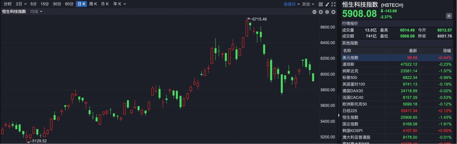 恒生科技指数报收于5908.08点,下跌143.68点,跌幅2.37%,10月累计下跌8.62%。