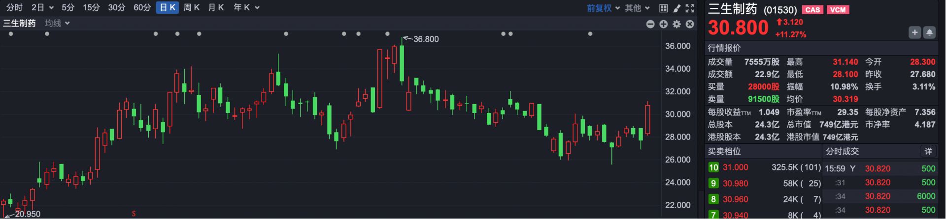 板块方面,主要板块全线回落,半导体、电器设备、煤炭、机械、可选消费、软件服务等板块均表现较差。不过,港股创新药板块逆势走强。其中,三生制药(01530.HK)大涨超11%,映恩生物-B(09696.HK)涨超10%,信达生物(01801.HK)涨超7%,复星医药(02196.HK)涨超6%。