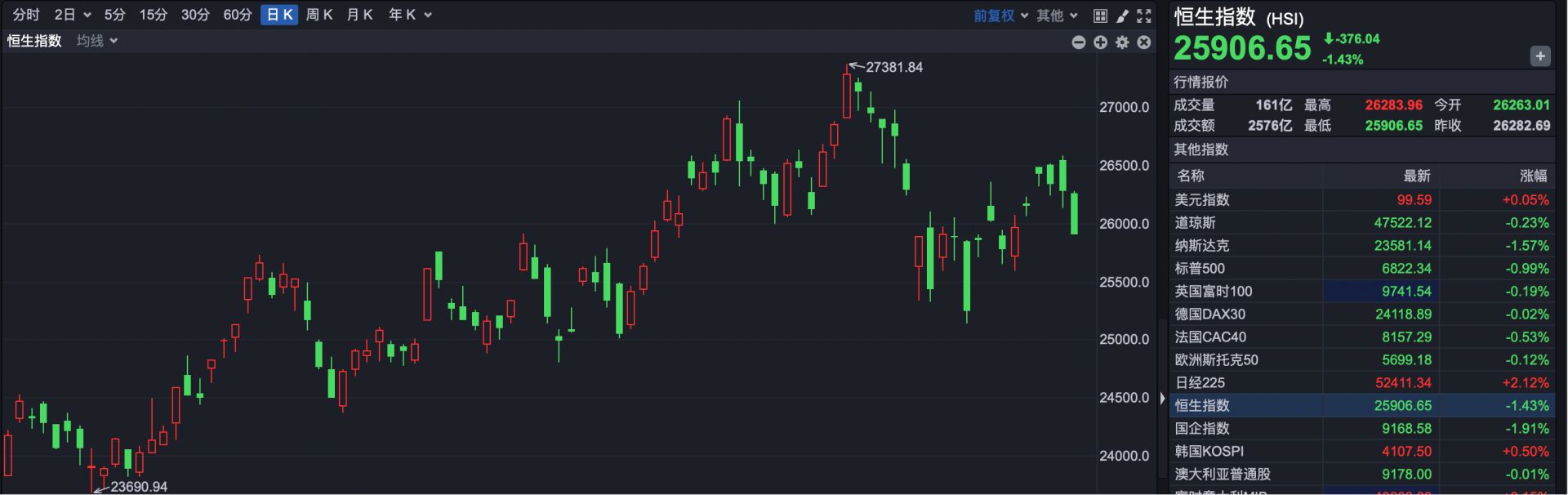 截至收盘,恒指报收于25906.65点,下跌376.04点,跌幅1.43%,10月累计下跌3.53%。