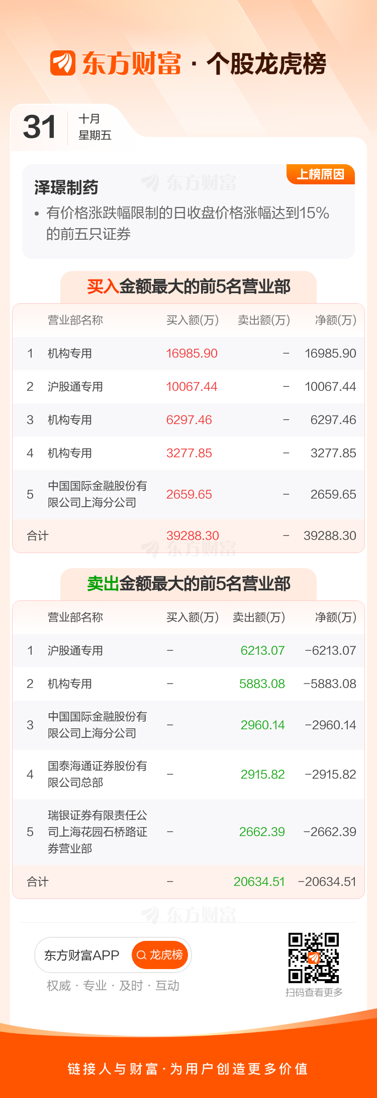 交易所2025年10月31日公布的交易公开信息显示,泽璟制药因成为有价格涨跌幅限制的日收盘价格涨幅达到15%的前五只证券上榜。泽璟制药当日收报103.88元,涨跌幅16.14%,偏离值16.14%,换手率3.52%,成交额9.24亿。