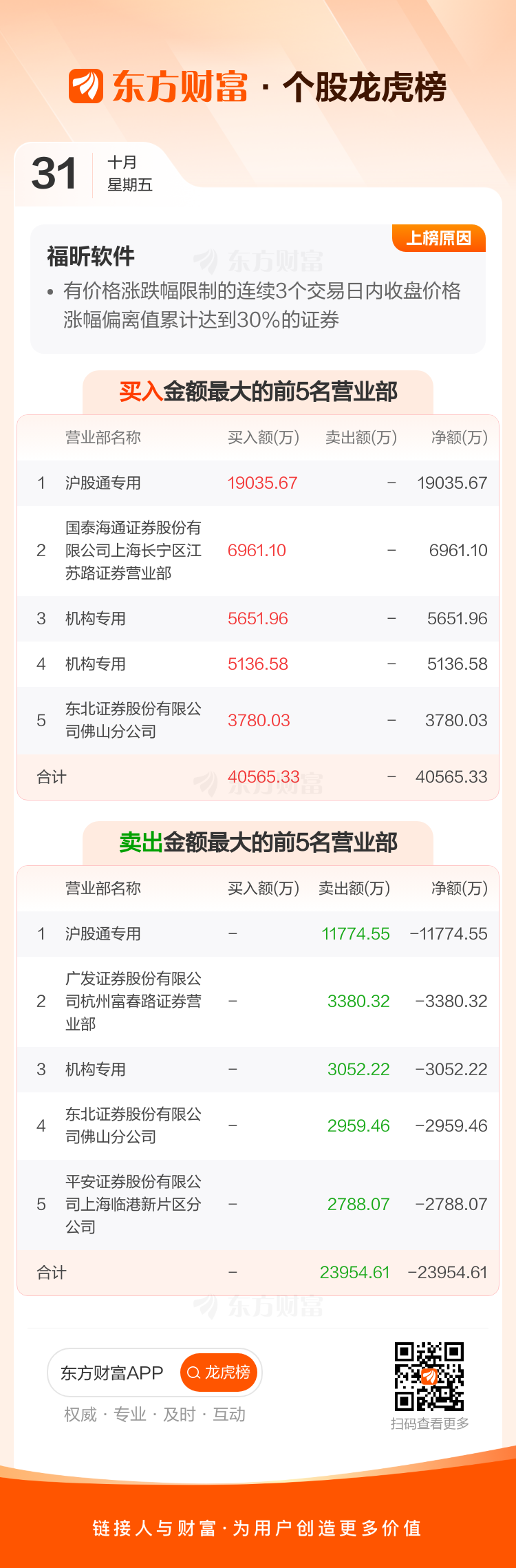 交易所2025年10月31日公布的交易公开信息显示,福昕软件因成为有价格涨跌幅限制的日收盘价格涨幅达到15%的前五只证券、有价格涨跌幅限制的连续3个交易日内收盘价格涨幅偏离值累计达到30%的证券上榜。福昕软件当日收报107.4元,涨跌幅20.00%,偏离值20.00%,换手率11.56%,成交额10.56亿。异常期间10月30日至10月31日,期间涨幅38.83%,累计偏离值43.77%,区间成交额20.98亿。