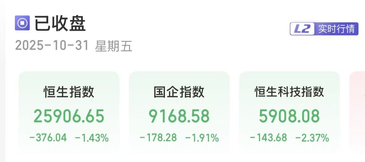 10月31日,港股三大指数集体收跌。截至收盘,恒生指数跌1.43%,报25906.65点;恒生国企指数跌1.91%,报9168.58点;恒生科技指数跌2.37%,报5908.08点。