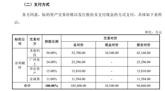 本次交易的总对价为10.54亿元。其中,新莱福计划以现金支付约1亿元给圣慈科技,剩余的对价则通过发行股份的方式支付。