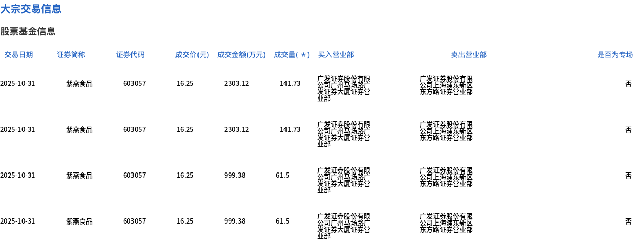 紫燕食品今日大宗交易折价成交406.46万股,成交额6605万元