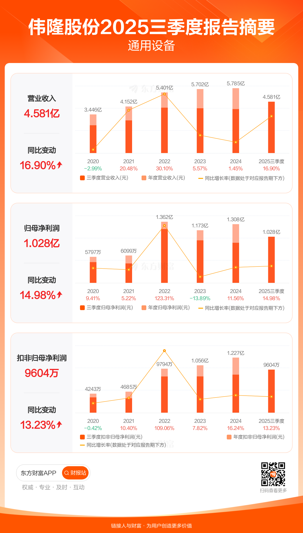 伟隆股份10月28日发布2025年三季报显示,公司前三季实现营业收入4.58亿元,同比增长16.90%;归母净利润1.03亿元,同比增长14.98%;扣非归母净利润9604.33万元,同比增长13.23%