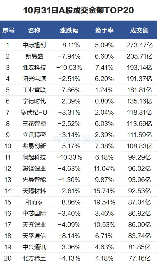 活跃个股:中际旭创成交273亿元 海科新源换手率55%