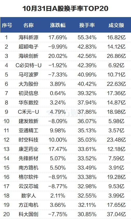 当天换手率最高的个股为海科新源,全天换手率55.34%。超颖电子紧随其后,全天换手率42.83%。