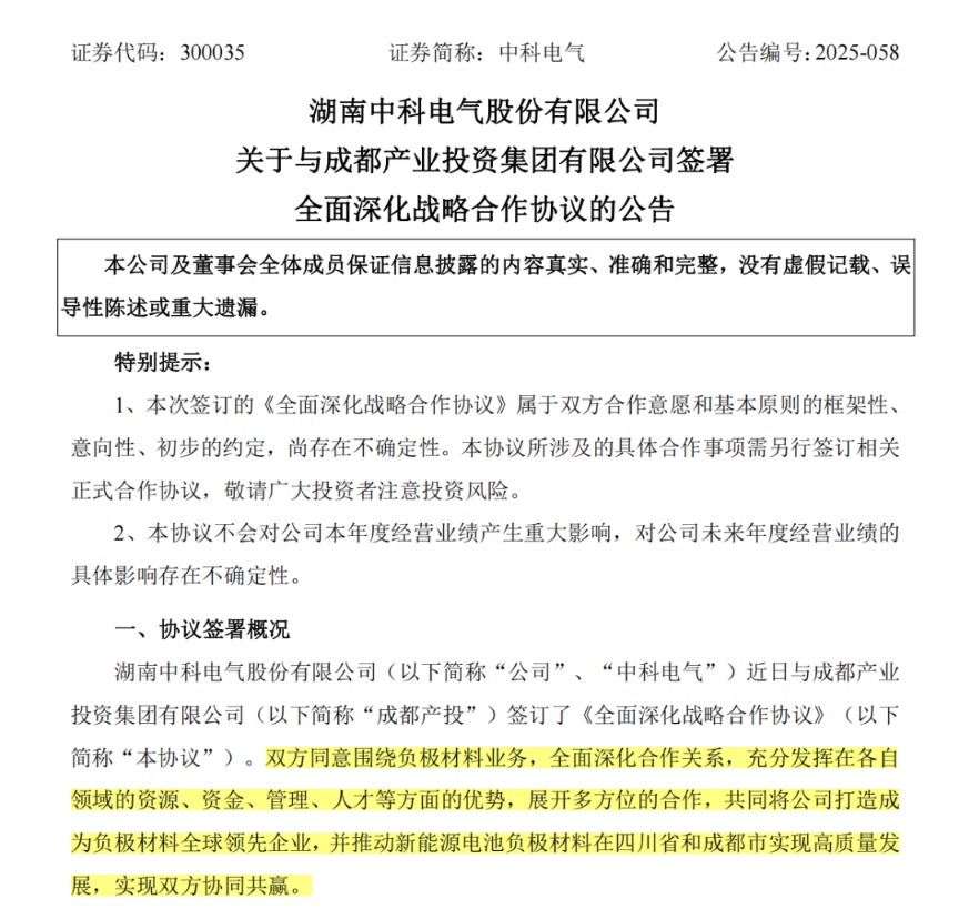 据协议,双方同意围绕负极材料业务,全面深化合作关系,充分发挥在各自领域的资源、资金、管理、人才等方面的优势,展开多方位的合作,共同将中科电气打造成为负极材料全球领先企业,并推动新能源电池负极材料在四川省和成都市实现高质量发展,实现双方协同共赢。