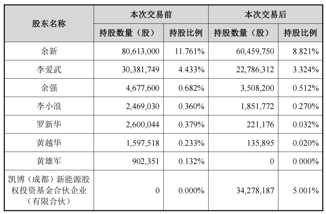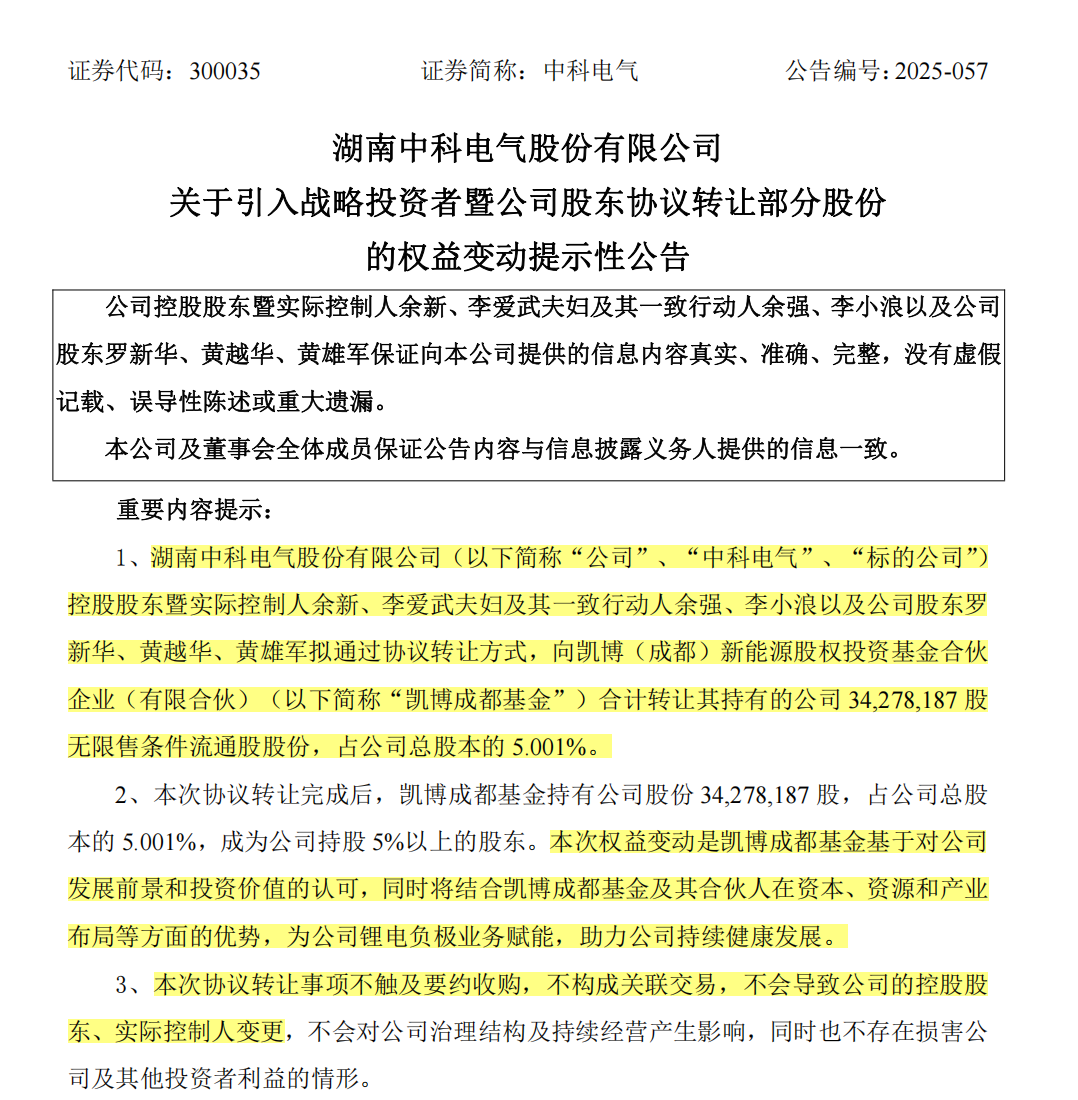 据公告,中科电气控股股东暨实际控制人余新、李爱武夫妇及其一致行动人余强、李小浪以及公司股东罗新华、黄越华、黄雄军拟通过协议转让方式,向凯博(成都)新能源股权投资基金合伙企业(有限合伙)(下称“凯博成都基金”)合计转让其持有的公司约3427.82万股无限售条件流通股股份,占公司总股本的5.001%。