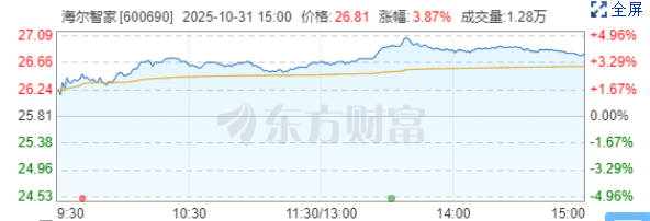 业绩超预期,海尔智家股价涨幅近5%领涨家电板块
