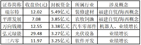 从封板资金来看,今日涨停板个股中,封板资金排名前5的个股包括瑞尔特、平潭发展、万向钱潮、弘元绿能、三六零。
