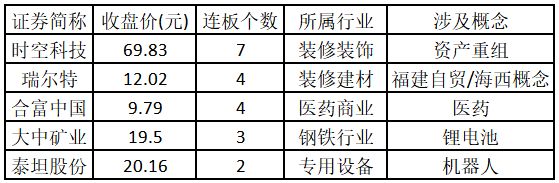 从连板情况来看,今日首板个股有48只;2连板的个股有5只;3连板及以上的个股有4只。今日连板数排名前5的个股包括时空科技、瑞尔特、合富中国、大中矿业、泰坦股份,具体如下表所示。