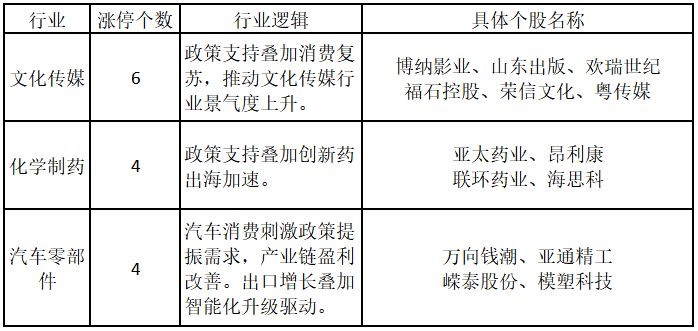 从行业特征来看,今日涨停板个股中,文化传媒、化学制药、汽车零部件行业的个股最多。