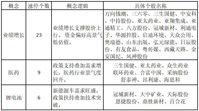 从概念特征来看,今日涨停板个股中,业绩增长、医药、锂电池概念的个股最多。