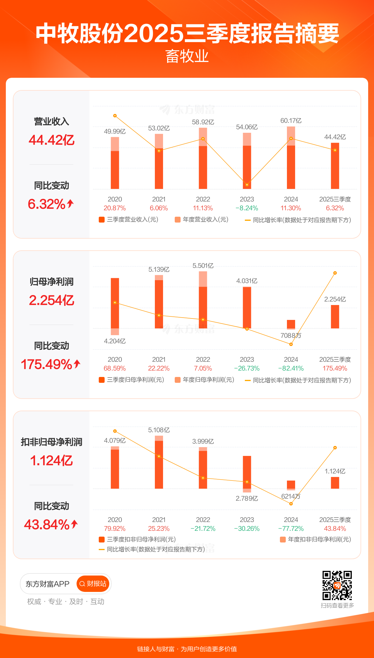 中牧股份10月28日发布2025年三季报显示,公司前三季实现营业收入44.42亿元,同比增长6.32%;归母净利润2.25亿元,同比增长175.49%;扣非归母净利润1.12亿元,同比增长43.84%。