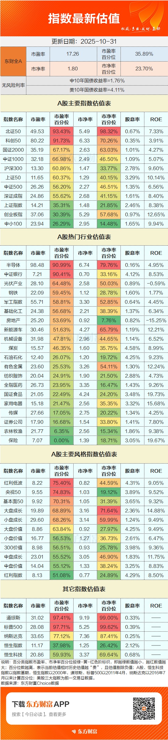 截至10月31日收盘,东方财富Choice数据显示,东财全A市盈率为17.26倍,市盈率百分位为35.89%;市净率为1.8倍,市净率百分位为23.7%。