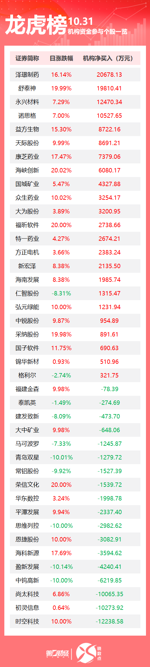 当天机构净买入前三的股票分别是泽璟制药、舒泰神、永兴材料,净买入金额分别是2.07亿元、1.98亿元、1.25亿元。