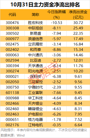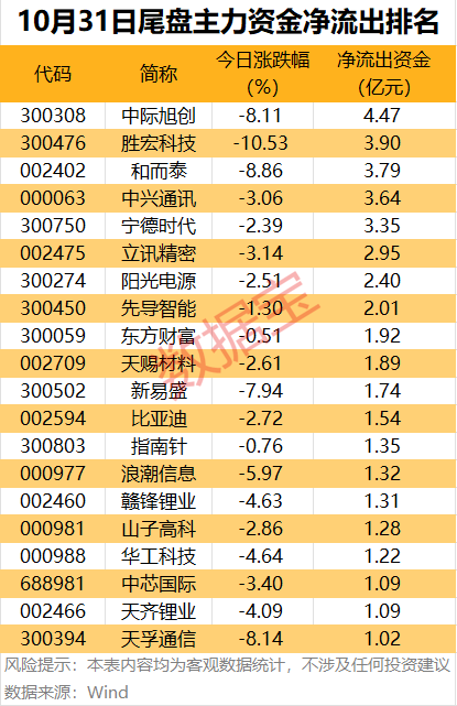 尾盘主力资金净流出方面,中际旭创、胜宏科技、和而泰、中兴通讯、宁德时代尾盘主力资金净流出均超3亿元;立讯精密、阳光电源、先导智能尾盘主力资金净流出均超2亿元。