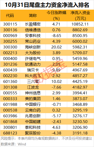个股方面,长盈精密尾盘主力资金净流入1.09亿元;信维通信、安泰科技、常山药业、海峡创新、大为股份等尾盘主力资金净流入均超5000万元。