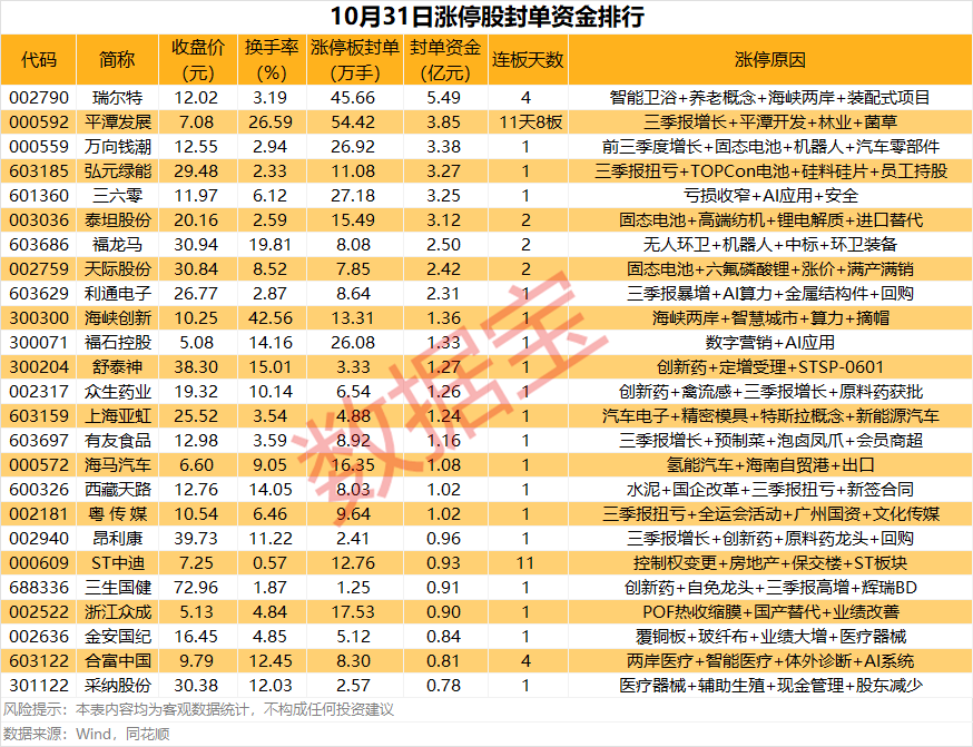 今日(10月31日)A股市场收盘共77股涨停,剔除掉20只ST板块个股后57股涨停,42股封板未遂,整体封板率为64.71%。