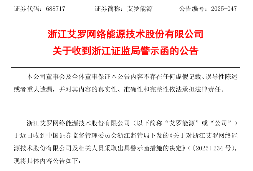 10月31日,艾罗能源(688717)发布公告,近日收到中国证券监督管理委员会浙江监管局下发的警示函,指出公司在募集资金管理中存在违规问题。