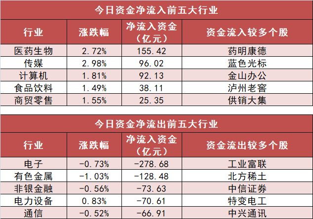 3.医药生物行业净流入155.42亿元居首