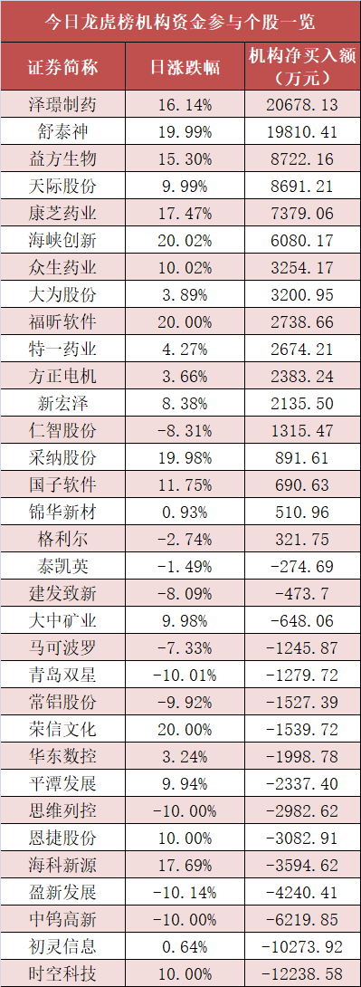 盘后龙虎榜数据显示,机构现身多股,其中泽璟制药等股票呈现机构资金净买入,时空科技等股票呈现机构资金净卖出。