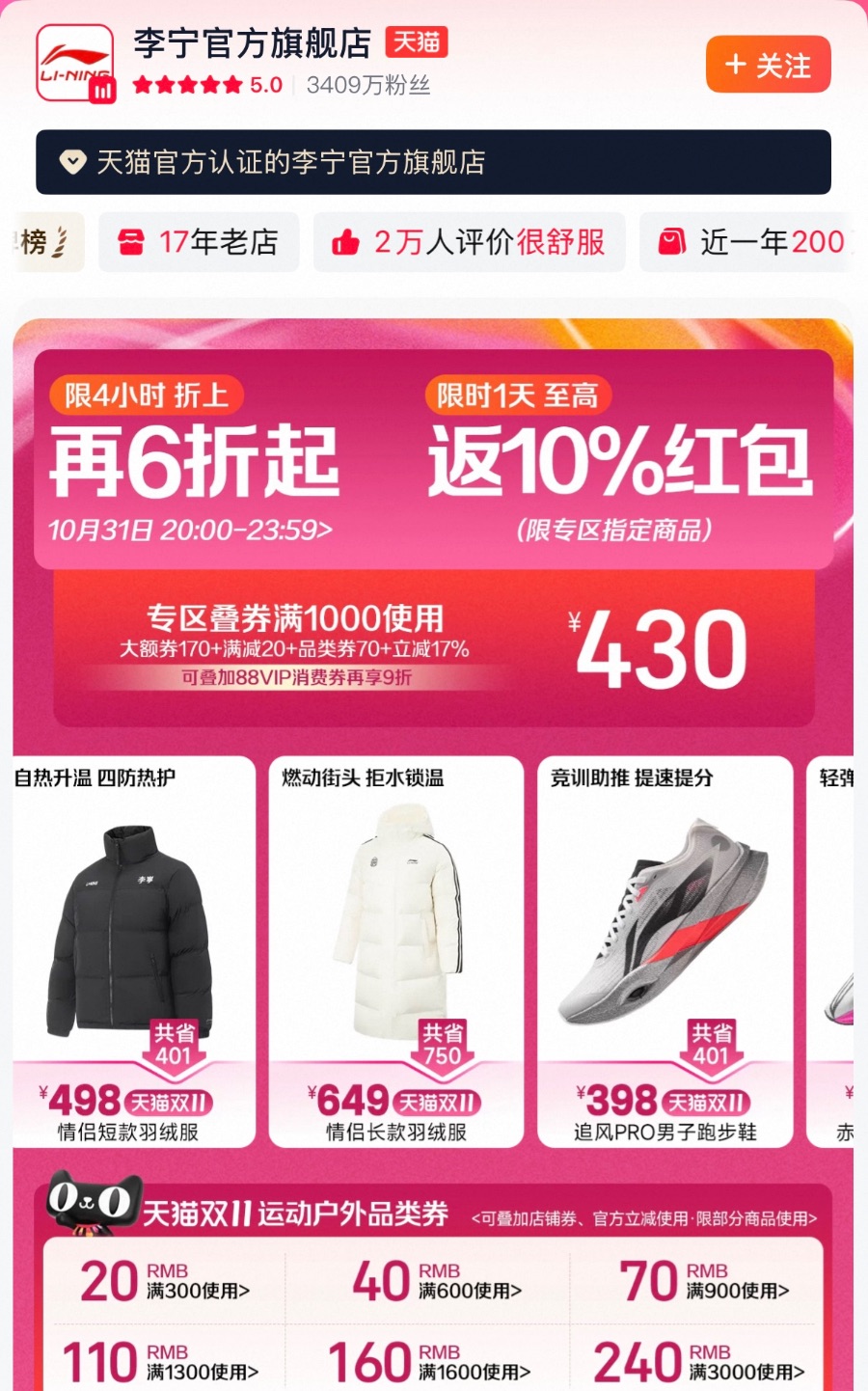 安踏以天猫“折上再6折起”的力度打响双十一大战。李宁在天猫、京东均推出“折上再6折起”的基础优惠,京东还有会员满600减212的满减券,抖音主打“限时折扣3折起”。