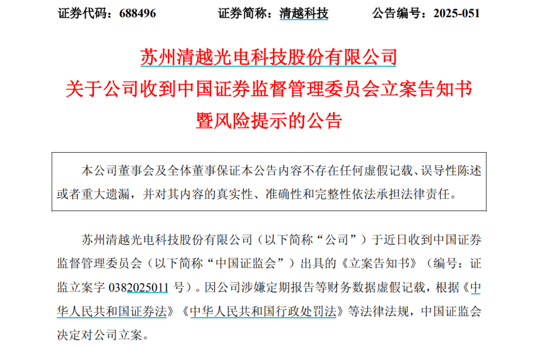 【导读】涉嫌定期报告等财务数据虚假记载,清越科技被中国证监会立案