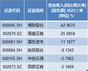 不过,2025年前三季度,也有6家券商的营业收入出现下滑。其中,湘财股份(600095)的营收下滑幅度最高,超过40%,达到42.96%。