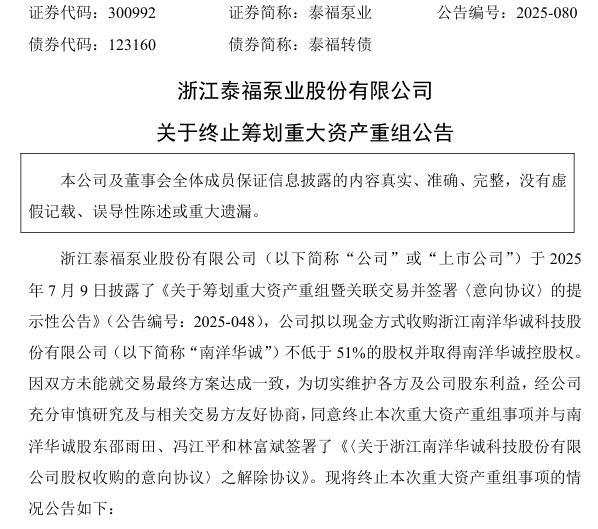 同日,泰福泵业(300992)公告称,公司原拟以现金方式收购浙江南洋华诚科技股份有限公司(简称“南洋华诚”)不低于51%的股权并取得南洋华诚控股权。因双方未能就交易最终方案达成一致,为切实维护各方及公司股东利益,经公司充分审慎研究及与相关交易方友好协商,同意终止本次重大资产重组事项并与南洋华诚股东邵雨田、冯江平和林富斌签署了《〈关于浙江南洋华诚科技股份有限公司股权收购的意向协议〉之解除协议》。公司承诺自本公告披露之日起至少1个月内不再筹划重大资产重组事项。