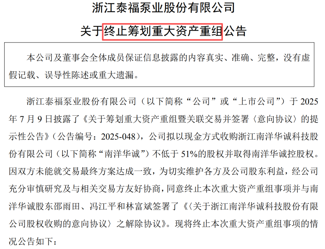 10月31日晚,泰福泵业发布公告称,终止以现金方式收购浙江南洋华诚科技股份有限公司(以下简称南洋华诚)不低于51%的股权并取得南洋华诚控股权。公司给出的理由是双方未能就交易最终方案达成一致。