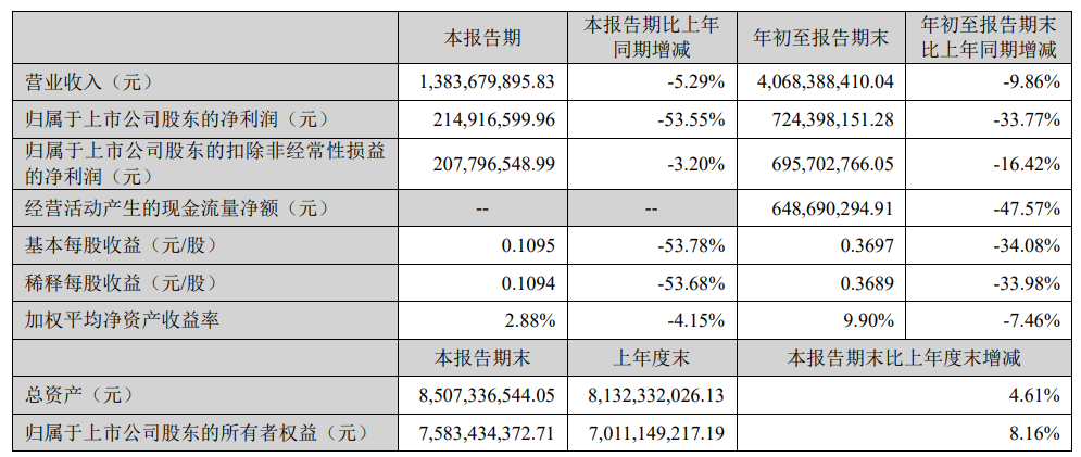 其中第三季度,公司营业收入为13.84亿元,同比下降5.29%;归母净利润为2.15亿元,同比下降53.55%;扣非归母净利润为2.08亿元,同比下降3.20%。
