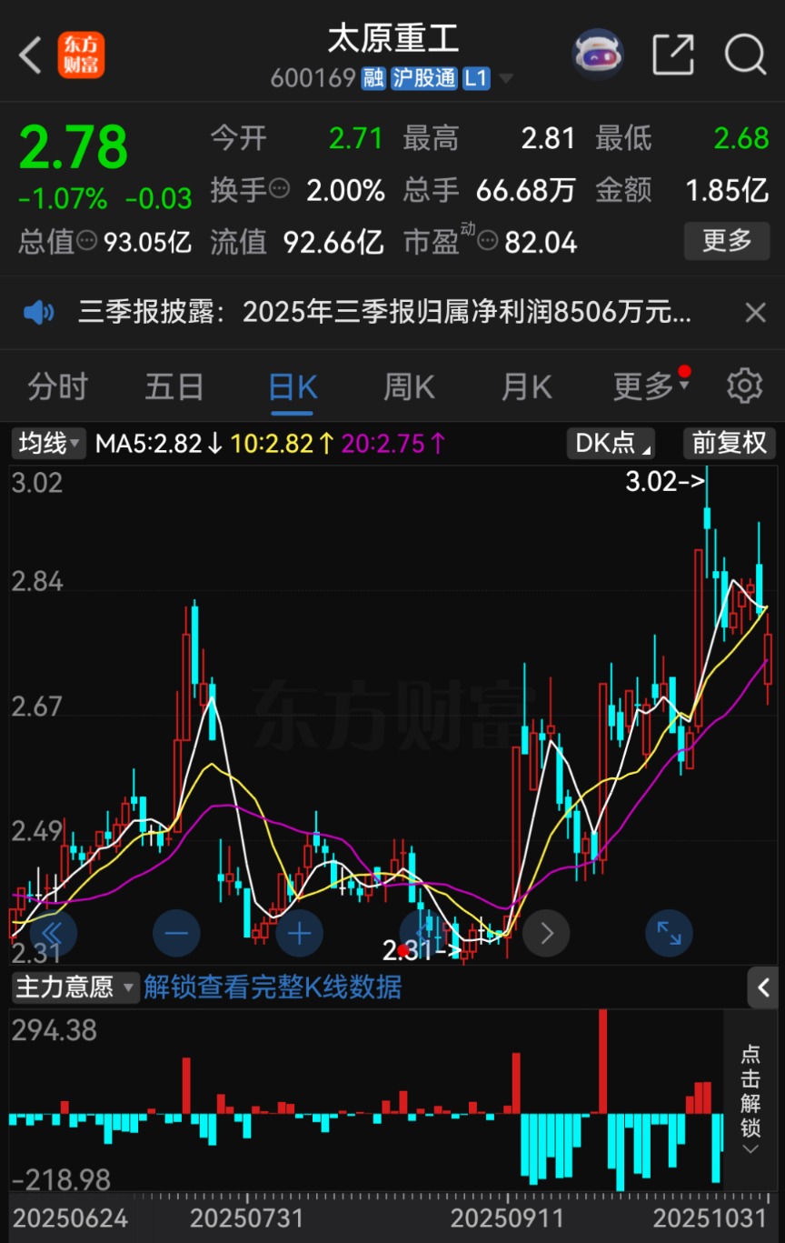 太原重工计划自11月3日开市起停牌1天。截至10月31日收盘,太原重工股价报2.78元/股,跌幅1.07%,总市值为93.05亿元。