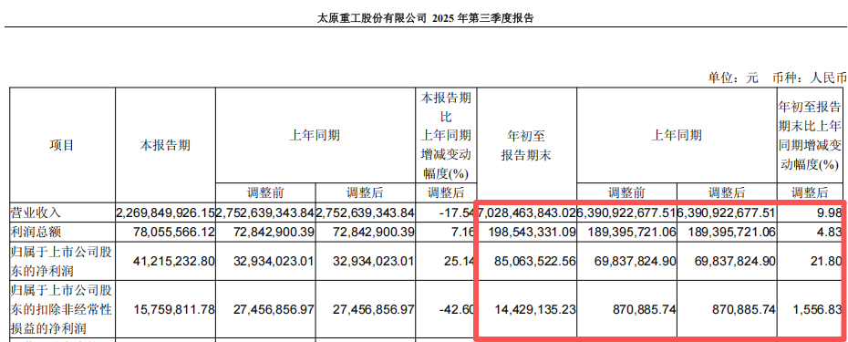 10月31日晚间,太原重工发布2025年三季报显示,公司2025年前三季度的营业收入同比增长9.98%至70.28亿元,归母净利润同比增长21.80%至8506.35万元。
