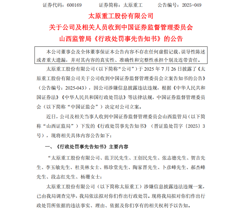 公告显示,近日,山西证监局下发的《行政处罚事先告知书》,披露了太原重工及相关当事人涉嫌违法的事实。