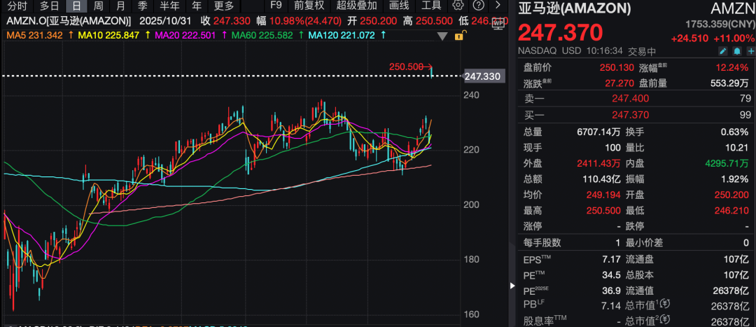 亚马逊开盘大涨11%,市值骤增近3000亿美元,超过2.6万亿美元。