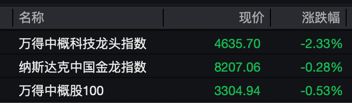 中概股表现弱势,纳斯达克中国金龙指数飘绿,万得中概科技龙头指数跌超2%。